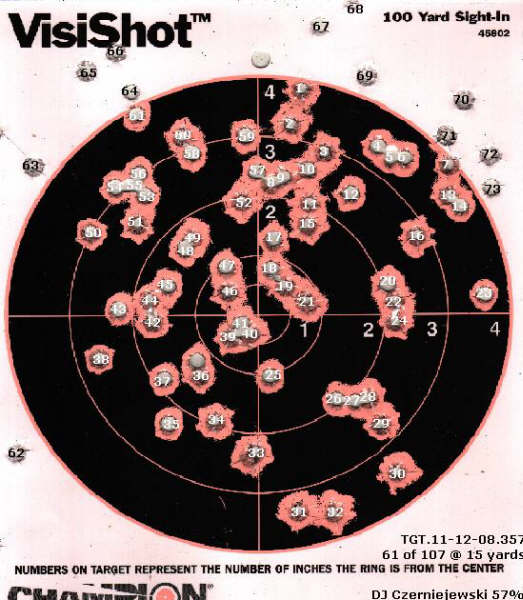 I put the target back out to 15 yards and it showed. Of 107 fired, I only got 61 in the black. That was my .357. I left the .32 at home, I know I'm good with it!