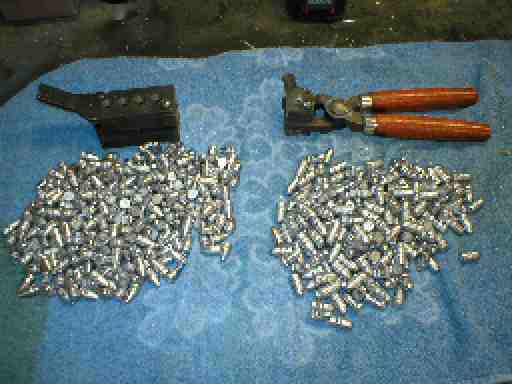 Here's a few links for you I-owe. Maybe you can find more info on all the goodies needed. At the very least, you should find enough info to get thoroughly confused! LOL and the above is available as a pdf file here For those that do not cast bullets or those that do and don't get the performance they think they should get, this may be of interest to you. Starting from the begining. Cast bullets are the cheapest way to shoot a lot. I get my lead mostly free from local tire shops. Sometimes I just go to the shop on Sunday when they are closed and mine the parking lot. During the summer the workers are in the habit of just throwing the old wheel weights at the barrel and most of them end up outside. I can get 5 lbs or so every Sunday. Some turn up their nose at wheel weights citing unknown quality of lead etc, but I have never had a problem with them. Others say only linotype is the way to go or to buy lead in ingots from a foundary. What ever you can afford I say. The wheel weights are mostly free. When we are at shopping centers (this is the only reason I let Lt. Linda drag me along) I walk the parking lots and usually pick up 4 or 5 lbs of wheel weights. Some are hard to get off tho. Truck stops have huge wheel weights and you can get them for almost nothing.(now lead is considered a toxic material so they have to pay someone to take it away) Anyway I use wheel weights almost exclusively. Now wheel weights are normally about MN 11 to 12 where as pure lead runs BN 4. Linotype is BN 21. So you can see if you want to shoot WW (wheel weight)bullets you might have to keep the velocites down or get leading of your barrel. But there is a way to make WW's harder. After you cast the bullets and they have cooled down for a couple of hours and before you size and lube them, take them inside to your wife's oven. (Preferably when she is not home) Use a cookie sheet and spread the bullets out one layer deep and not touching each other. Then put the temperature dial at 450 degrees. (it is that round dial in the center of the back of the stove and usually says oven on it and some numbers) Bake the bullets for 1 hour and then take the directly out of the oven and pour them into a white plastic bucket half full of cold water. (use pot holders or heavy gloves) If you are not sure about the oven temperature somewhere in the kitchen cabinets your wife should have a oven temperature gage. It will look like a car temp gage but be mounted on a little stand. Put that in with the bullets and check it every once and a while to keep from melting your bullets. (they will melt at 600 deg.) This will raise the BN hardness of your cast lead WW bullets to about BN 30 or even harder than linotype. I have found that bullets this hard will work real well in rifles especially 30-30 rifles and other bolt action rifle of 30 cal. do not use cast lead bullets in rifles that have gas operated systems because they will gum up the piston with lead flash. Good luck and remember to put the cookie sheet in the dish washer before the wife gets home. Sarge Good rule of thumb to determine the proper BHN for the cartridge you are loading for; divide the average chamber pressure in PSI (not CUP) of your load by 1,422. Example: 30,000 psi chamber pressure equals a BHN of 21 for proper base obturation (base upset). Wheel weights make a great source of lead as is or with the addition of a little antimony to make it a bit more ductile. Anyone casting bullets needs to have a copy of Veral Smith's Jacketed Performance with Cast Bullets. (Lead Bullets Technology, HCR 62 Box 145, Moyie Springs Idaho 83845). This book will open your eyes and make you reconsider what "we all know" about cast bullets. With all due respect to my handgunning hero Elmer Keith, you will find that scientific testing of his bullets shapes and loads prove them to not be all we thought. SSL Spent all of Friday casting bullets. Got a question tho. Now I have been casting bullets since the late 60's and thought I had seen everything that could happen. I have had bullets that turned out frosty (to hot) wrinkled (to cold) and shiny (just right) but this time I noticed that some of the bullets had colors on them. (No I was not drinking malt) The colors range from blue to red to black. The bullets had no voids or other unnormalcies that I could see by the naked eye. And the colors came off when I sized them. I looked in the molds and could see no deposits or bad spots. What is happening? They don't seem to affect the bullets or I hope they don't. I haven't shot them yet. Perhaps a little strange allow in my lead? You can see the dark bullets below in the normal looking ones. Sarge  Make that "alloy in my lead" Sarge, I think you are seeing the sheen from an extremely light coating of oxide on the surface of the slugs. Sometimes heat causes oxides to form a very thin film on some metals when they are melted. When you size them, you are removing the thin film of oxide. I assume that you are thoroughly fluxing the metal before casting. Also does the colors seem similar to the film that floats on the mass of molten alloy? Safari, yes that is what it looks like. I hadn't put the two together, but you are right. But how does it get to my bullets from my bottom pour Lee Production pot? I flux every time I add more metal with bees wax because I have lbs. of the stuff. (I have two bee hives in my yard) It will burn off quite well and brings the dross to the top for skiming. Like I say, it doesn't seem to bother the bullets but I was curious about the stuff showing up on my bullets. Thanks for the info. Now how do I get rid of it? LOL Sarge | From: Honcho | Sent: 11/3/2003 9:54 PM | | Hi, Sarge-- One question, regarding the bullets, did you weigh them, as compared to earlier bullets cast in the same mold? If you find a substantial weight difference, it may be that your alloy mixture is different from previous batches. I find when I'm casting, if I use too much Tin and Antimony in the mixtu