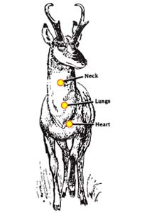 | Game quartering toward you presents similar situation to an animal quartering away. Note aiming points. |