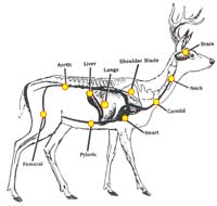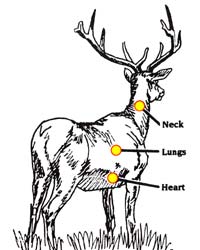| Aiming points for vital organs on frontal shot: try for upper part of heart so bullet will also hit lungs. |